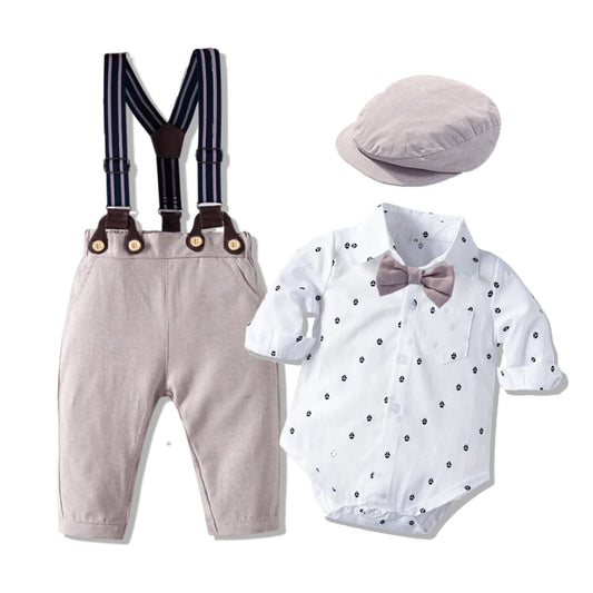 Baby Boy Birthday Gentleman Romper Clothes Set with Hat Cotton Spring Fall Toddler Kid Printed Bodysuit Dress Infant Outfit Suit